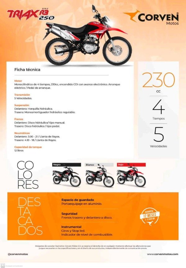 MOTOR Monocilíndrico de 4 tiempos,230cc, encendido CDI con avance electrónico. Arranque eléctrico / pedal de arranque. TRANSMISIÓN 5 Velócidades. SUSPENSIÓN Delantera: Horquilla hidráulica. Trasera: Monoamortiguador hidráulico regulable. FRENOS Freno delantero: Disco hidráulico. Freno trasero: Disco hidráulico. NEUMÁTICOS Neumático delantero: 3.00 - 21 / Llanta de Rayos. Neumático trasero: 4.10 - 18 / Llanta de Rayos. CAPACIDAD DE TANQUE 12 litros